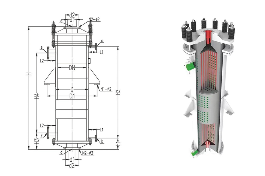 由柱形不滲透性石墨塊、石墨上下蓋、石墨上下封頭及金屬外殼、壓蓋等組裝而成,加裝壓力彈簧作為熱脹冷縮的自動補償,以起到密封作用,耐溫耐壓性能強、抗熱沖擊性能好、體積利用率高、傳熱效果好,非常便于裝拆檢修,圓塊孔式石墨換熱器設備制造時不采用黏接劑,提高了使用溫度,延長了設備的使用壽命,占地面積小,零件通用性好,廣泛應用于化工、石油、管式、冶金、醫藥、電子、食品、環保等領域。